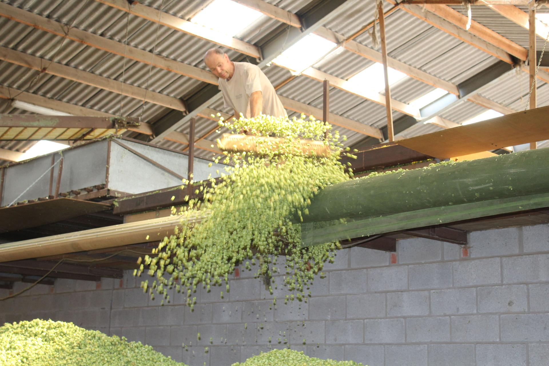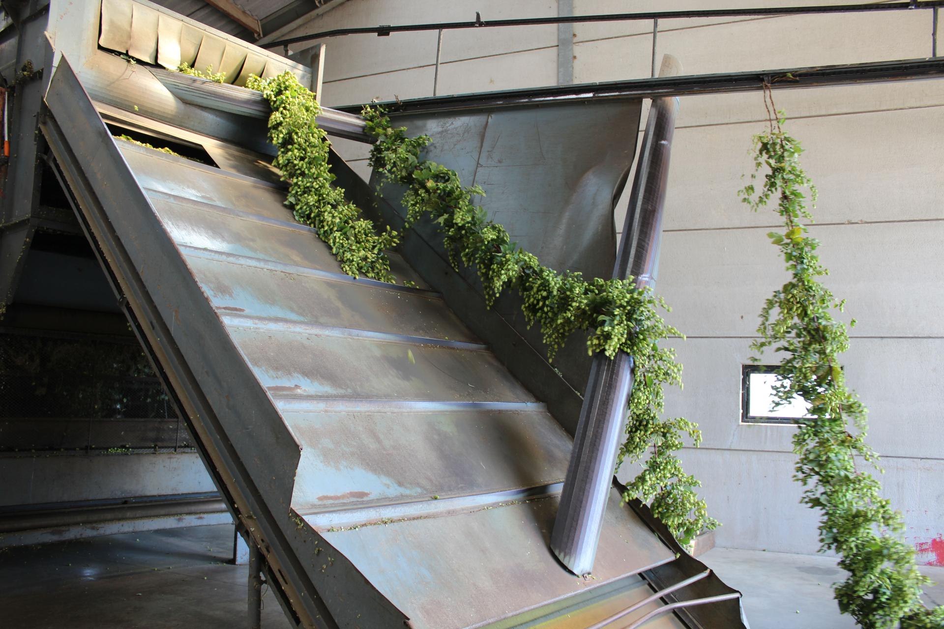 De grote machines verwerken de hopperanken netjes tot afzonderlijke hoppebellen, waarna deze gedroogd en verpakt worden. Een groot deel wordt hierbij tot pellets geperst.