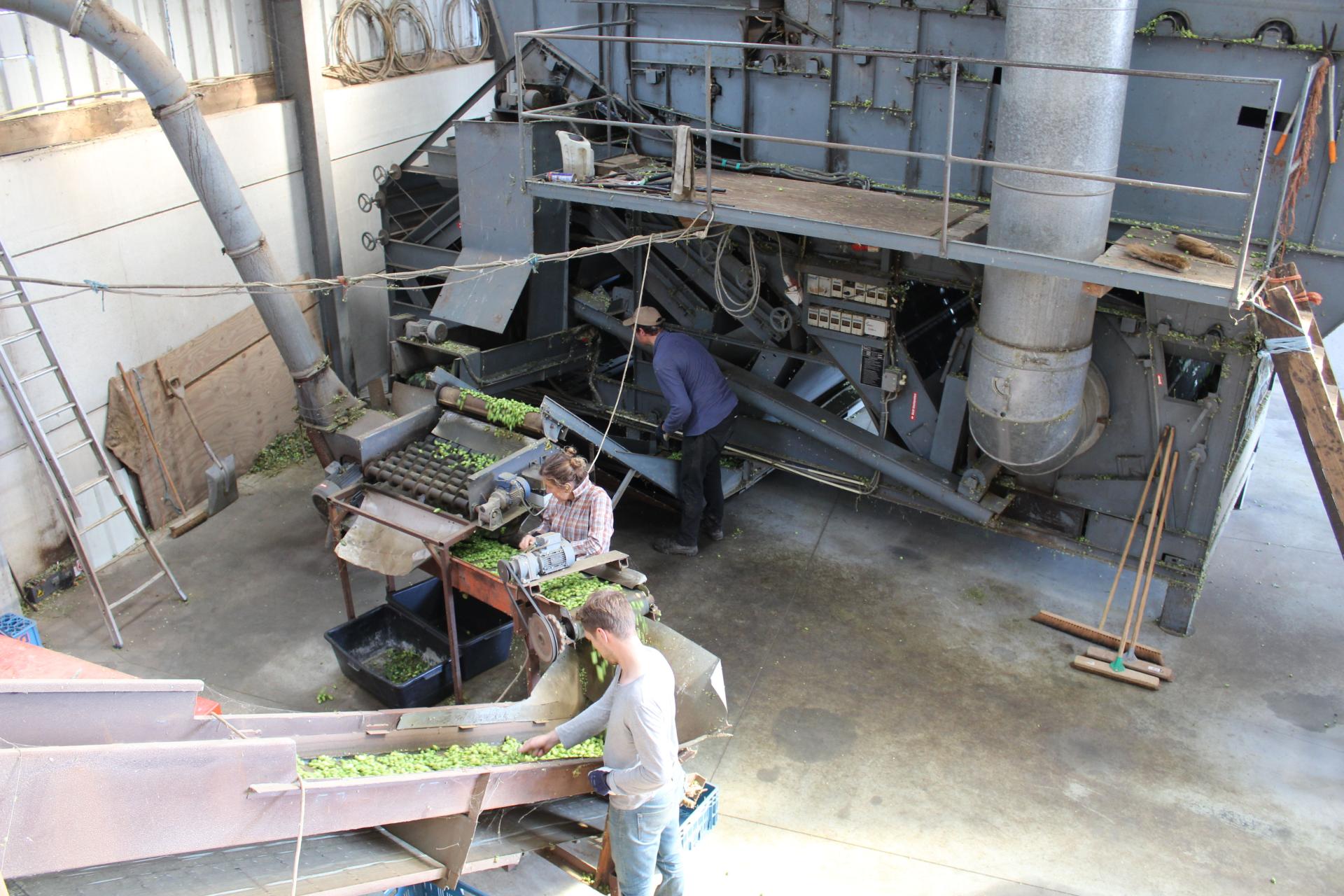 Een lekke tractorband gooide roet in het eten zodat we de feitelijke pluk niet konden zien, maar het verwerken van de hopperanken konden we in vol bedrijf bewonderen.